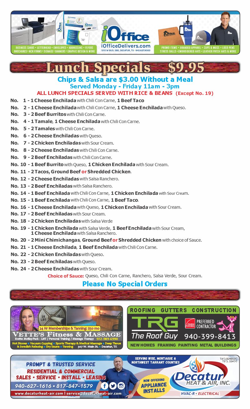 Page 4 | Lunch Specials $9.95 Casa Torres Online Menu Cover | Appetizers | Especials de Carne | Lunch Specials $9.95 | Lunch Specials & Kids Menu | Combination Dinners | Especials de la Cocina & Especials de Puerco | Desserts & Drinks Cover | Appetizers | Especials de Carne | Lunch Specials $9.95 | Lunch Specials & Kids Menu | Combination Dinners | Especials de la Cocina & Especials de Puerco | Desserts & Drinks
