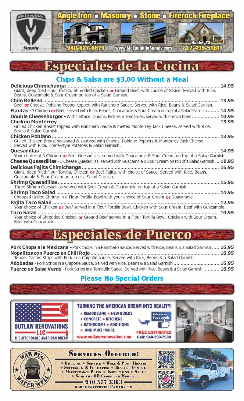Page 7 | Especials de la Cocina & Especials de Puerco Casa Torres Online Menu Cover | Appetizers | Especials de Carne | Lunch Specials $9.95 | Lunch Specials & Kids Menu | Combination Dinners | Especials de la Cocina & Especials de Puerco | Desserts & Drinks Cover | Appetizers | Especials de Carne | Lunch Specials $9.95 | Lunch Specials & Kids Menu | Combination Dinners | Especials de la Cocina & Especials de Puerco | Desserts & Drinks
